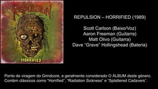 O documento lista 10 álbuns fundamentais de grindcore, incluindo Repulsion - Horrified (1989), considerado o álbum definidor do género, Napalm Death - Scum (1987), que apresentou um estilo agressivo e chocante, e Terrorizer - World Downfall (1989), projeto de membros dos Morbid Angel e Napalm Death.