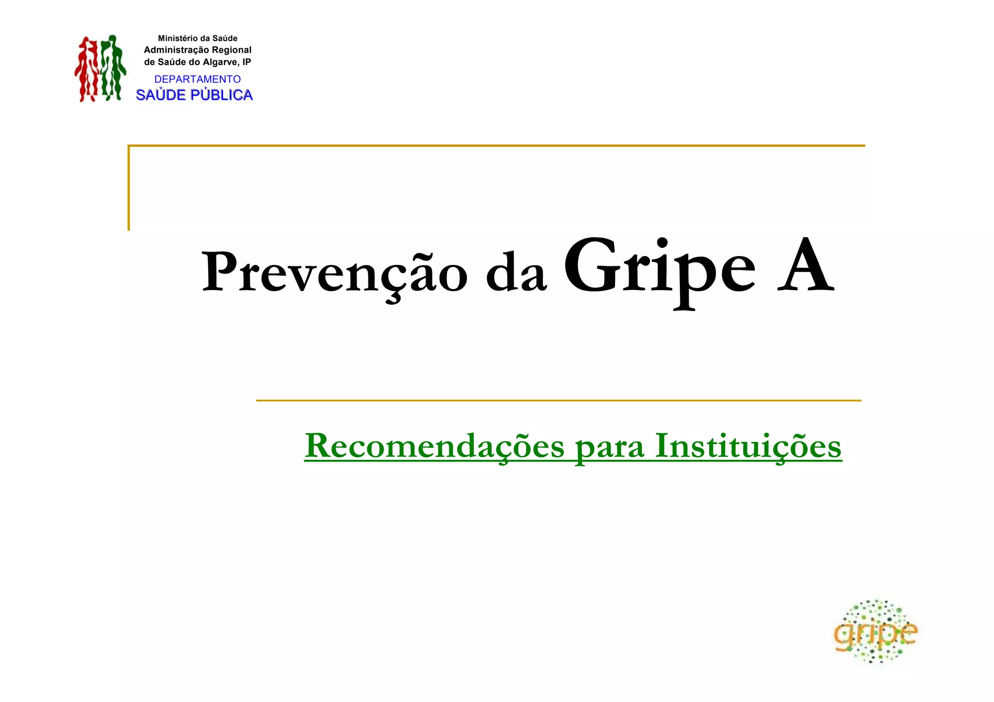 Este documento fornece recomendações para instituições sobre a prevenção da gripe, incluindo seus sintomas, modo de contágio, período de contágio, medidas de proteção individual e coletiva como lavar as mãos e limpeza de superfícies, e o que fazer em caso de regresso de uma zona afetada ou se pensa ter gripe. Reforça a importância de manter um plano de contingência actualizado.