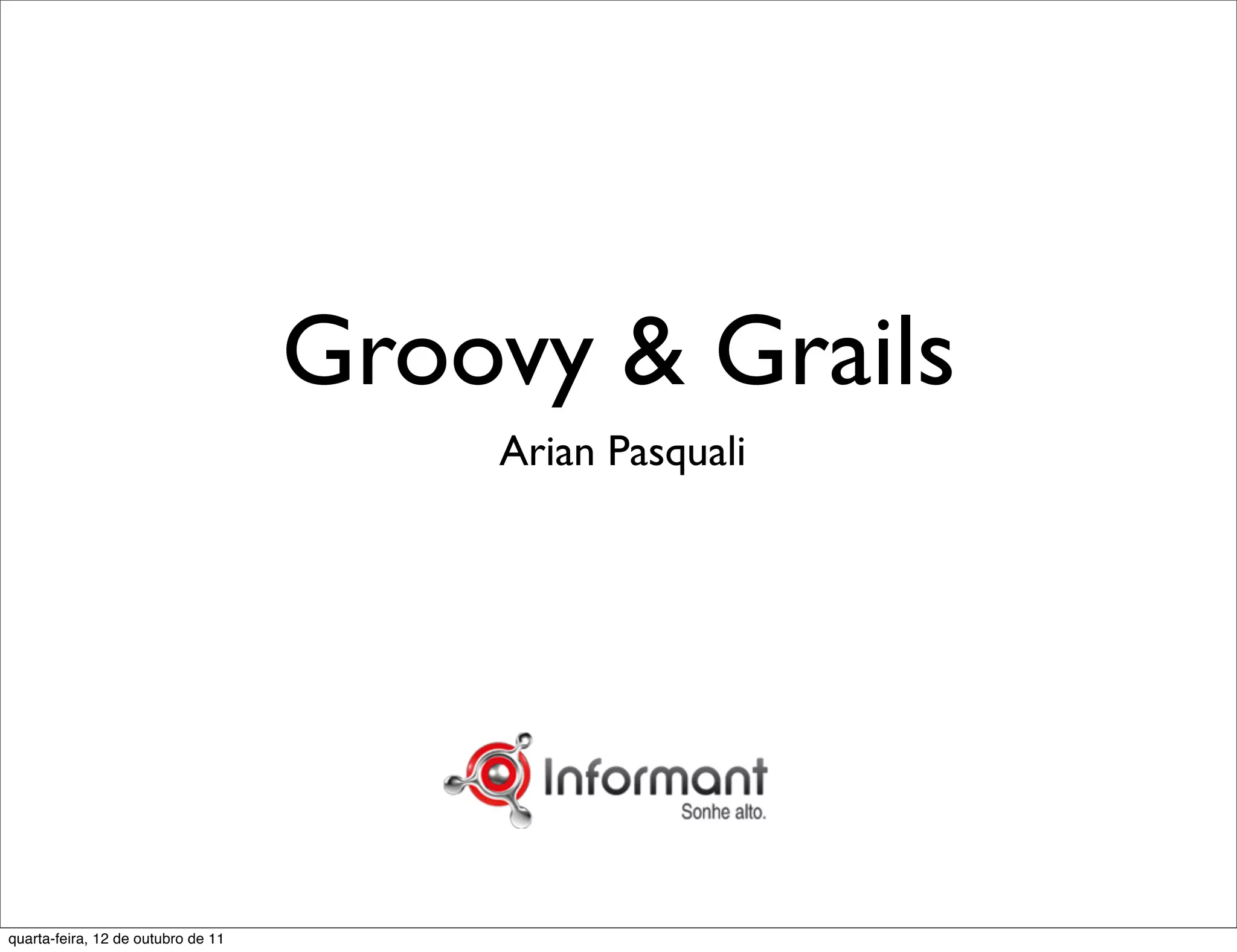 O documento apresenta uma introdução ao framework Grails para desenvolvimento web em Groovy. Ele discute como Grails fornece uma abordagem full-stack baseada em convenções ao invés de configurações, inspirando-se em frameworks como Ruby on Rails. O documento também descreve alguns dos principais recursos do Grails como mapeamento objeto-relacional, controle de dependências, scaffolding, internacionalização e plugins.