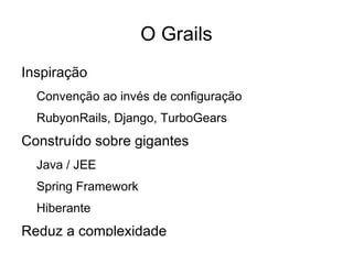 3) Grails possui características como GORM, scaffolding, internacionalização e testes que facilitam o desenvolvimento rápido de aplicações web.