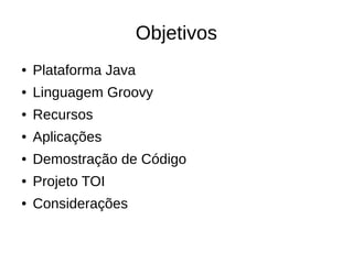 O documento discute a linguagem Groovy como uma alternativa dinâmica e de tipagem fraca para a plataforma Java. Apresenta os objetivos, características e recursos da linguagem como tipagem dinâmica, closures, coleções e facilidade para testes. Demonstra exemplos de código Groovy ilustrando essas funcionalidades.