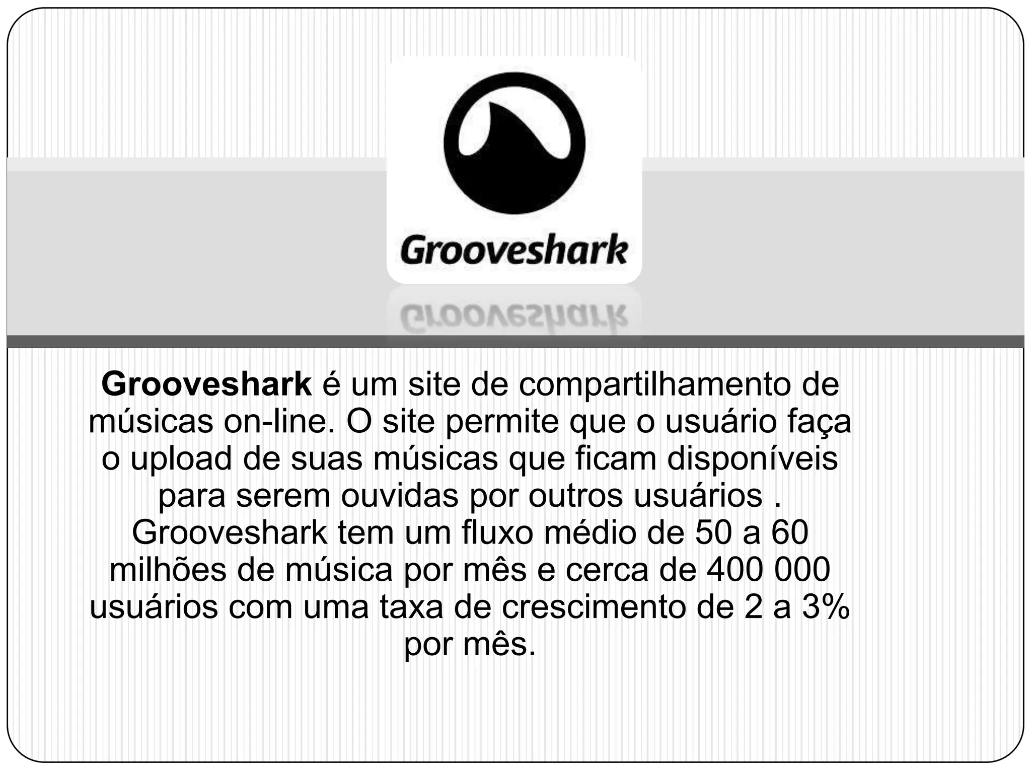 Grooveshark é um site de compartilhamento de música online que permite usuários fazer upload de músicas para serem ouvidas por outros, tem em média 50-60 milhões de músicas por mês e 400.000 usuários crescendo 2-3% por mês.