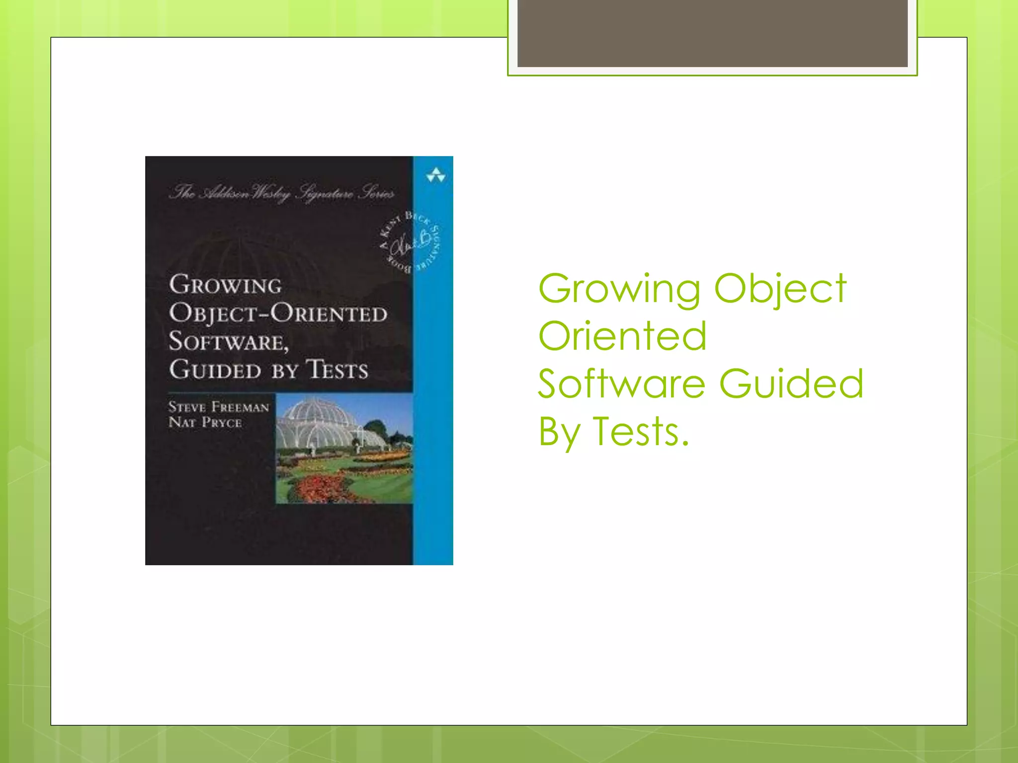 O documento apresenta os principais conceitos e benefícios do desenvolvimento guiado por testes (TDD), incluindo escrever testes antes do código, aumentar a confiabilidade e flexibilidade do software, e desenvolver software de forma incremental. Também discute técnicas como acoplamento vs coesão, padrões de projeto como CRC cards, e ferramentas como JUnit e JMock para TDD.