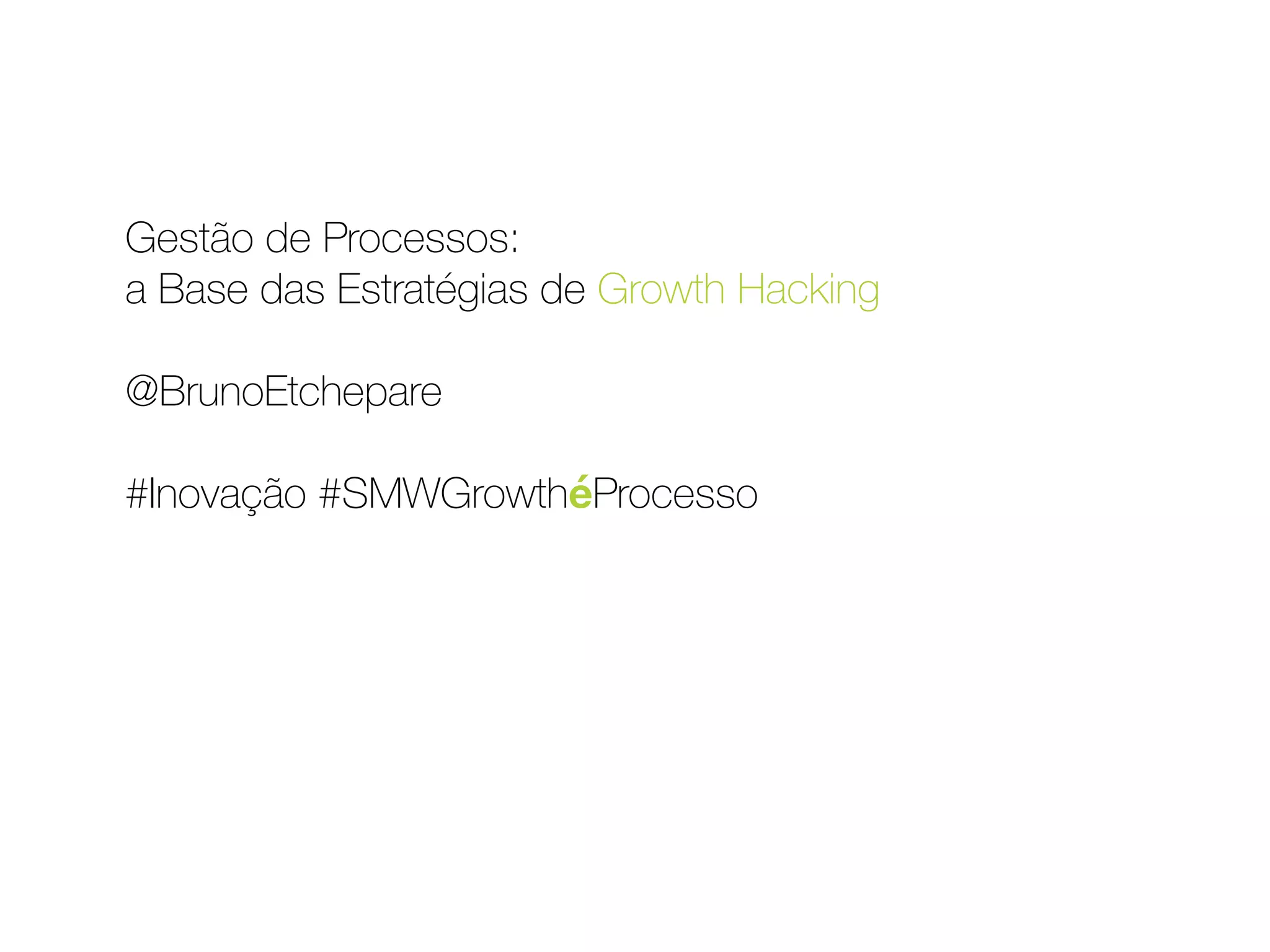 O documento discute estratégias de growth hacking, enfatizando a importância da gestão de processos e da experimentação para identificar com base em dados os meios mais eficientes para o crescimento sustentável de um projeto.