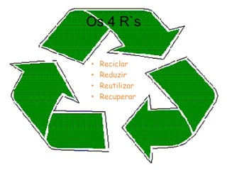 O documento discute os 4 R's da sustentabilidade - reduzir, reutilizar, reciclar e recuperar. Ele explica cada um desses conceitos e fornece exemplos de como aplicá-los corretamente, como depositar itens nos ecopontos verdes, amarelos e azuis ou no pilhão. O documento também descreve o que é um oleão e para que serve.