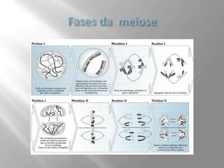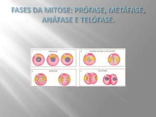 O documento descreve os processos de divisão celular mitose e meiose. Ele explica que a mitose produz duas células filhas idênticas a partir de uma célula mãe, enquanto a meiose produz quatro células haploides a partir de uma célula diploide. O documento também detalha as várias fases da mitose e meiose, incluindo a prófase, metáfase, anáfase e telófase.