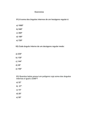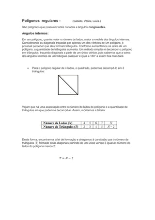 O documento discute polígonos regulares, definindo-os como aqueles que possuem todos os lados e ângulos congruentes. Explica que quanto mais lados um polígono tiver, maior será a medida de seus ângulos internos e que é possível decompor um polígono em triângulos traçando diagonais a partir de um vértice. Fornece uma tabela relacionando o número de lados de um polígono com a quantidade de triângulos formados e a fórmula T = L - 2, onde T é o número de triângulos e L