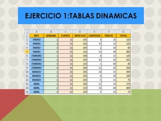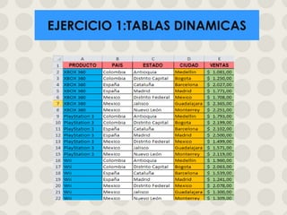 Este documento apresenta 5 exercícios sobre tabelas dinâmicas e formato condicional no Excel, começando com exercícios sobre tabelas dinâmicas, seguido por exercícios sobre formato condicional e terminando com mais um exercício.