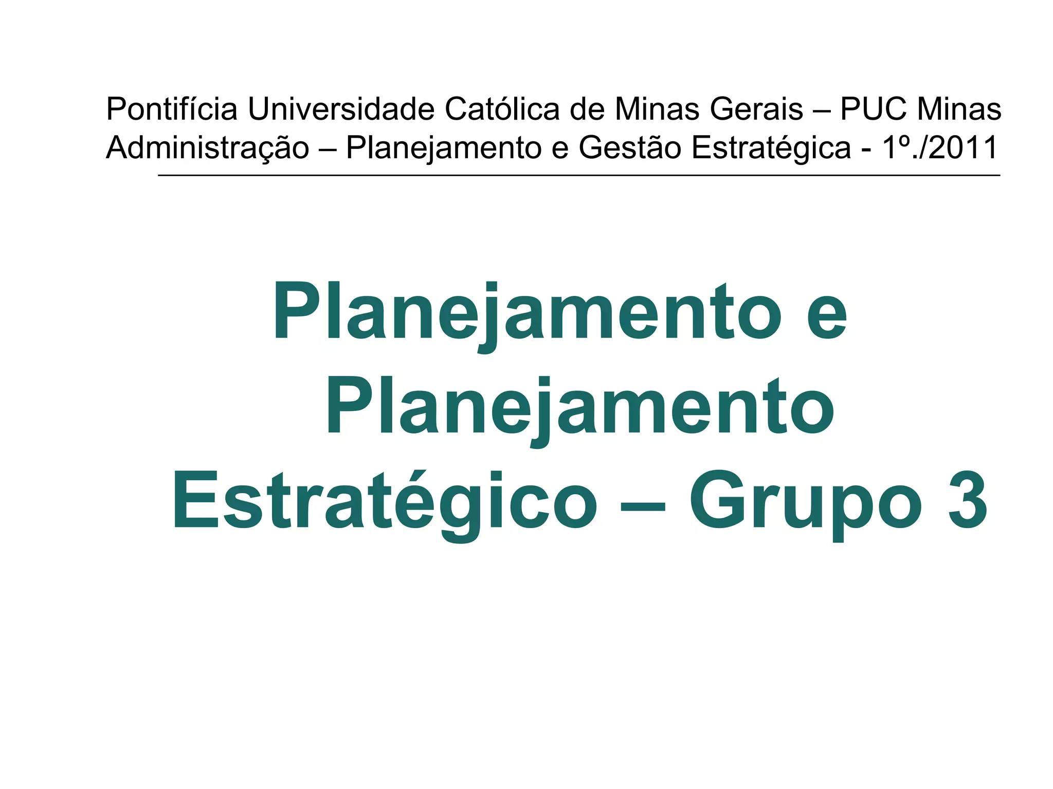 O documento discute conceitos de planejamento e planejamento estratégico, definindo-os como processos contínuos para alcançar objetivos futuros. Ele também descreve as etapas do planejamento estratégico e seus principais princípios, além de diferenciar os tipos de planejamento, incluindo estratégico, tático e operacional.