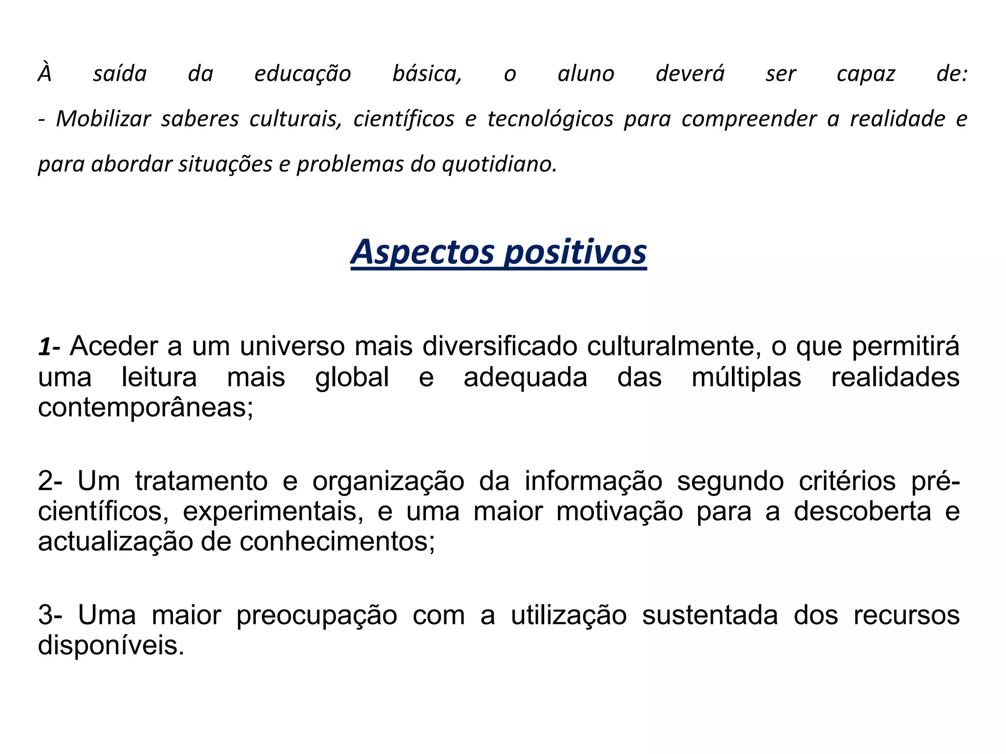 O documento discute as habilidades que os alunos deveriam ter ao sair da educação básica, incluindo a capacidade de mobilizar conhecimentos culturais, científicos e tecnológicos para entender a realidade e resolver problemas do dia-a-dia. Ele também lista aspectos positivos como acesso a diversidade cultural e abordagens pré-científicas de informação, e aspectos negativos como acesso rápido a muita informação sem organização adequada e deriva para o consumismo sem benefícios.