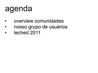 O documento discute a formação de grupos de usuários de tecnologia para compartilhar conhecimento. Ele fornece exemplos de comunidades existentes e sugestões para o estabelecimento de um novo grupo focado em .NET em Uberlândia, incluindo reuniões regulares, blogs e eventos para promover discussões técnicas.