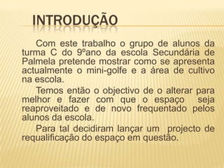 Um grupo de alunos propõe renovar a área do mini-golfe da escola, transformando-a em um anfiteatro ao ar livre e horta biológica para aproveitar os resíduos da merenda escolar. O projeto inclui construir uma estrutura coberta e restaurar o espaço envolvente.