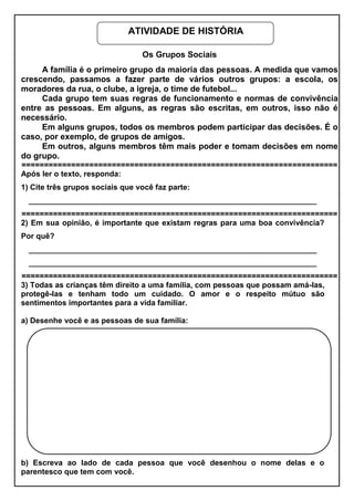 O documento discute os diferentes grupos sociais dos quais as pessoas fazem parte, como família, escola e clubes. Explica que cada grupo tem suas próprias regras e normas de convivência, sejam elas escritas ou não, e que em alguns grupos todos participam das decisões, enquanto em outros alguns membros têm mais poder de decisão.