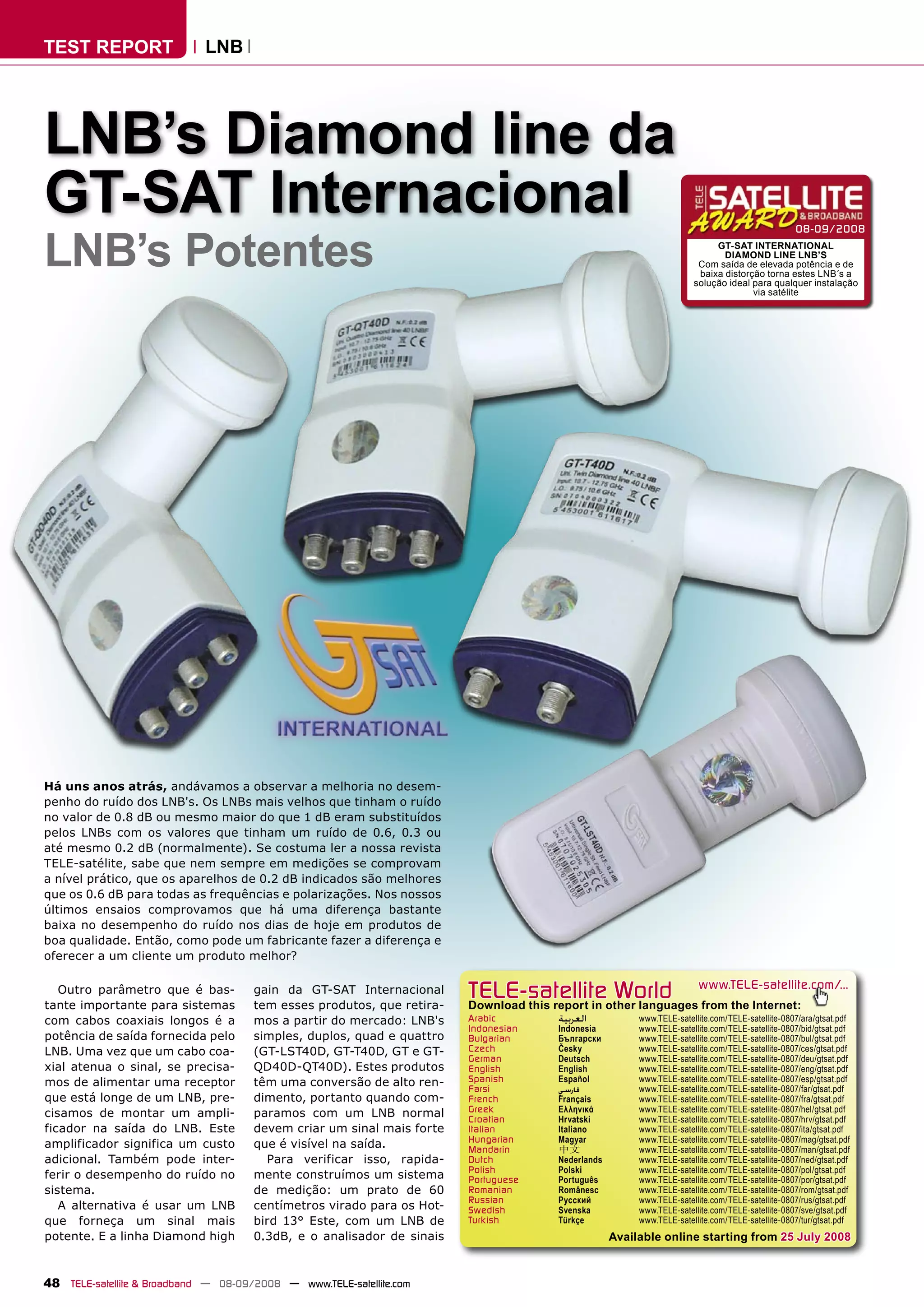 Os LNBs da linha Diamond da GT-SAT fornecem uma saída de sinal 7-12dB mais forte do que LNBs normais, compensando a atenuação de 30-50 metros de cabo coaxial. Eles apresentam um desempenho de ruído semelhante ou melhor do que LNBs de referência, com consumo um pouco maior de corrente. São uma escolha ideal para áreas com recepção difícil.
