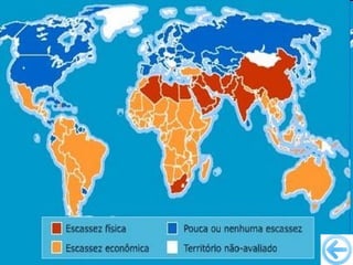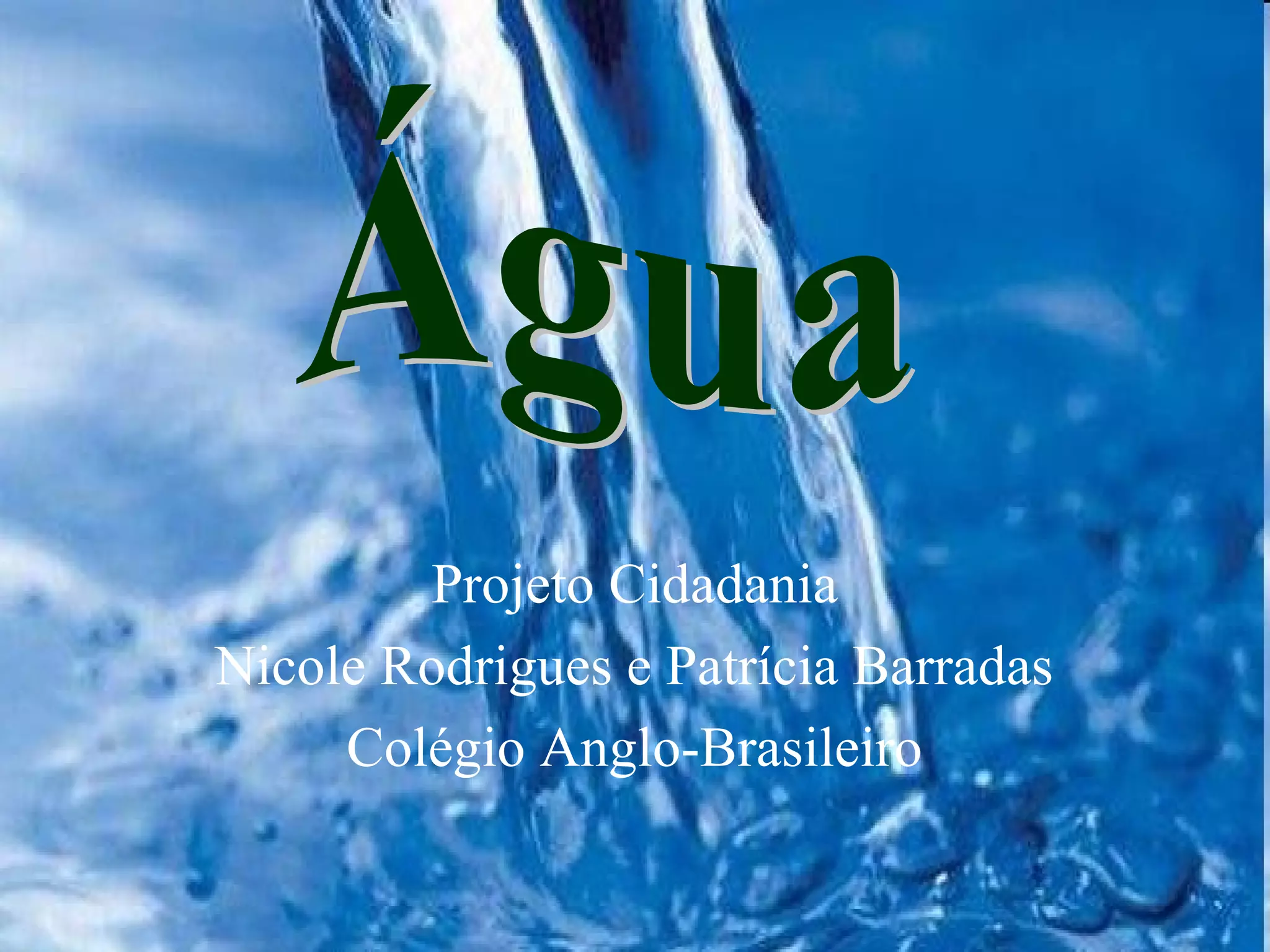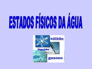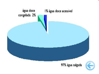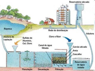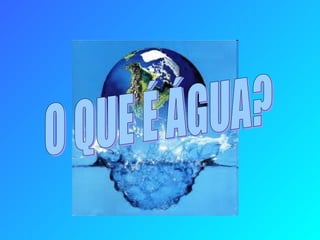 O documento discute a importância da água, seus estados físicos e ciclo na natureza. Também aborda processos como dessalinização e tratamento de esgoto, além de destacar problemas como escassez e desperdício de água e formas de uso mais sustentável deste recurso essencial.