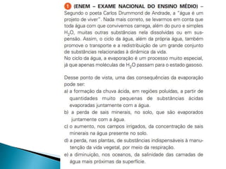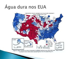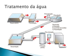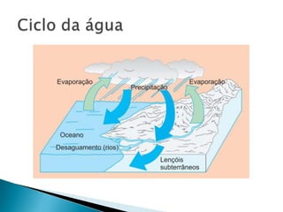 O documento discute as propriedades e usos da água no planeta Terra. A maior parte da água na Terra é salgada nos oceanos (97%), enquanto a água doce é 3% e encontrada em rios, lagos e reservatórios. A água é um solvente importante e sua forma sólida, o gelo, é menos densa que a forma líquida.
