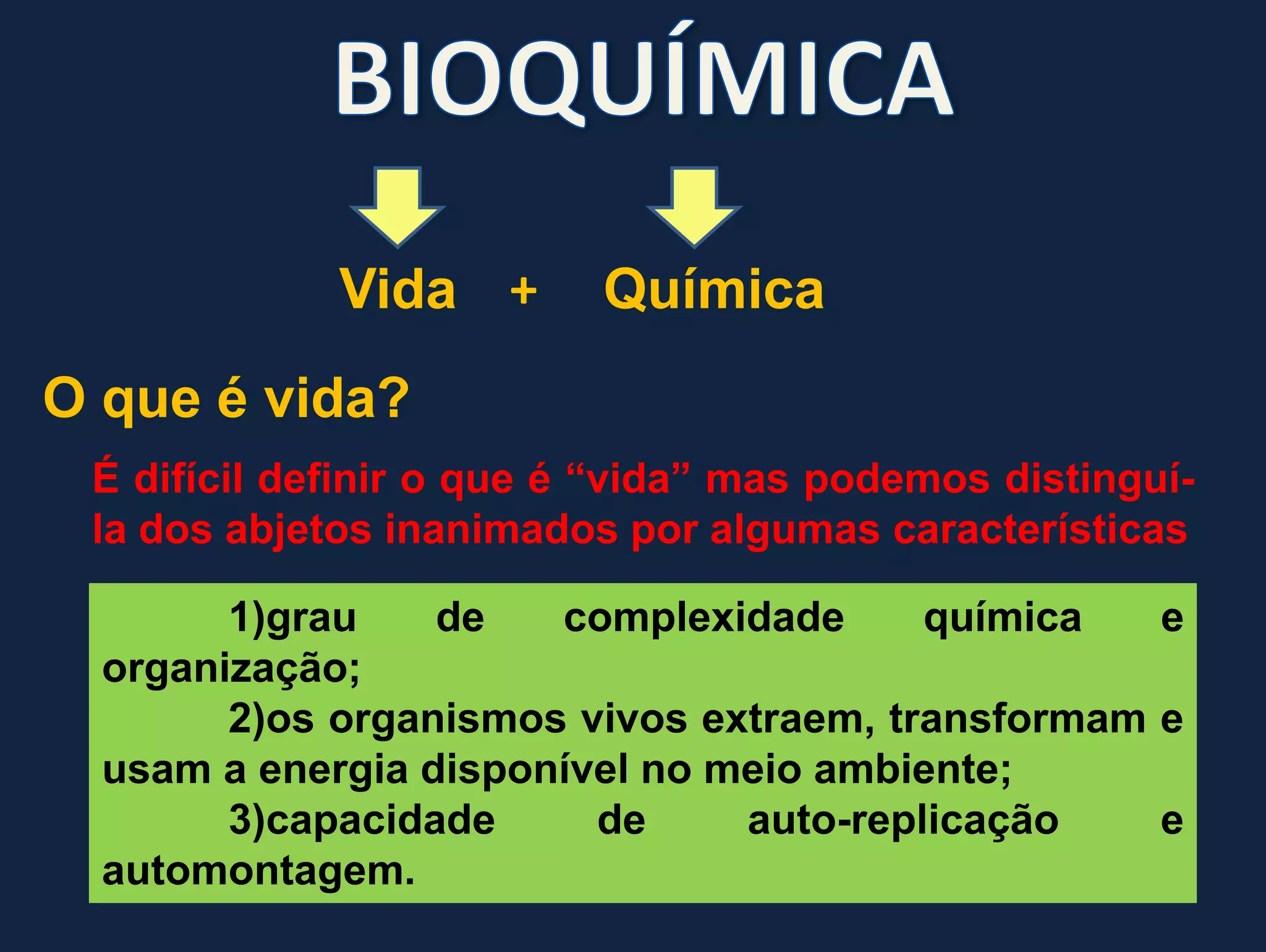 1) O documento discute os conceitos fundamentais de bioquímica, incluindo as características da vida, biomoléculas, e a importância da água para os sistemas vivos;