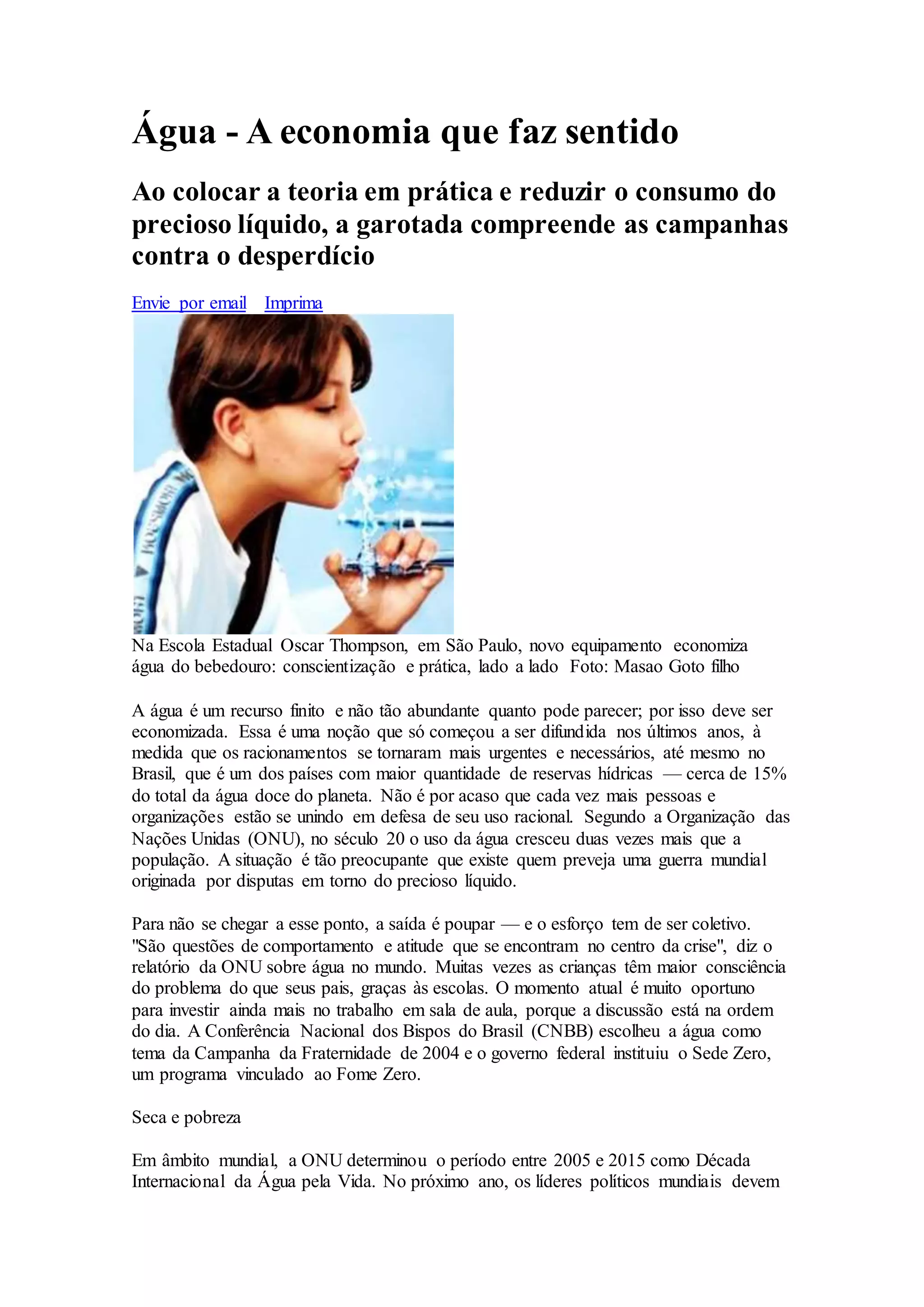 O documento discute programas de educação para economia de água em escolas brasileiras. Ele descreve como a Escola Estadual Oscar Thompson e a Escola São Camilo implementaram projetos interdisciplinares que ensinam aos estudantes sobre a importância da conservação da água e os levam a reduzir o consumo tanto na escola quanto em casa.