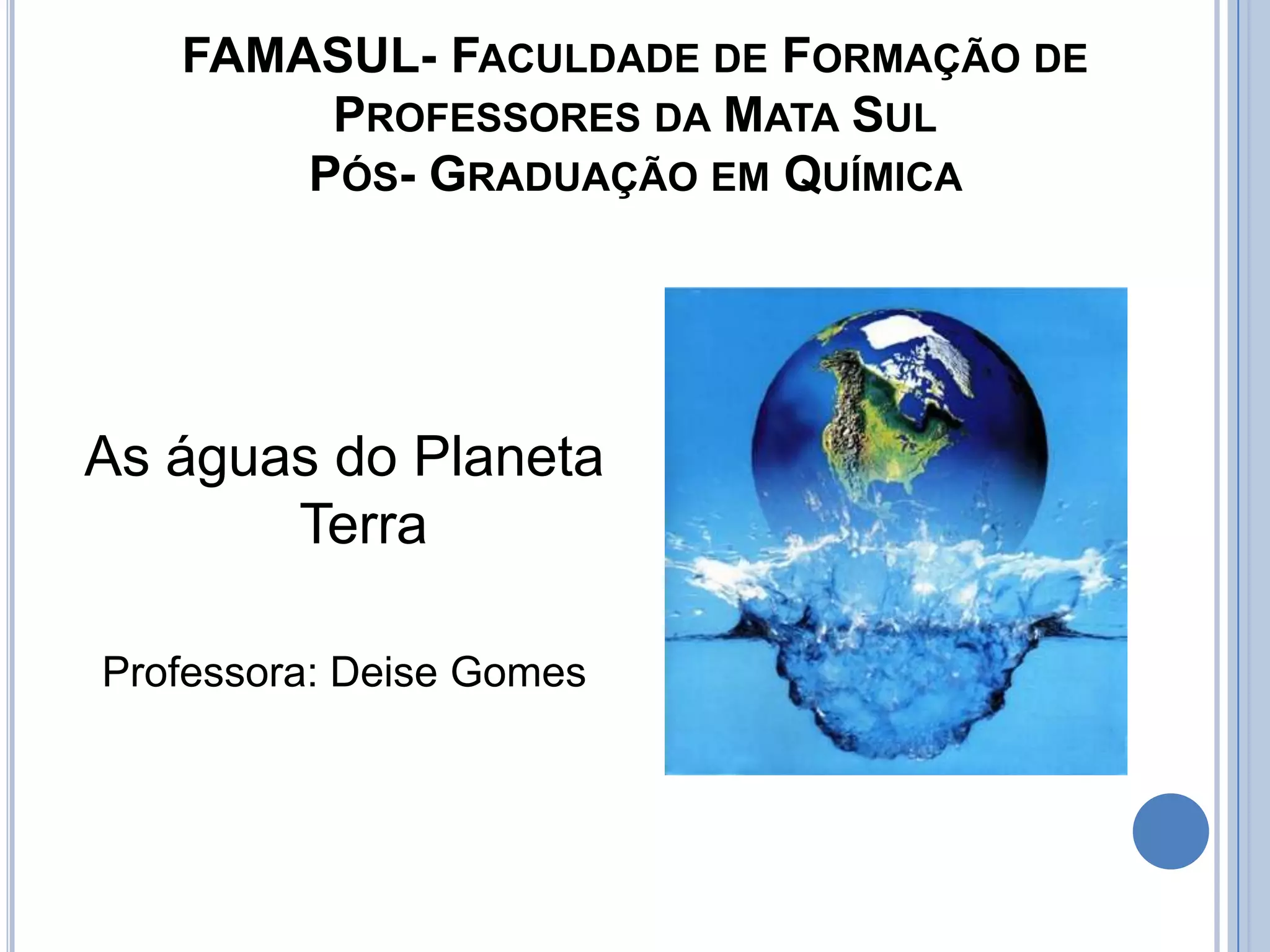 Distribuição da águana terraCiclo da água Qualidade e poluição da água Poluição das águas: os esgotos domésticos e industriais Bioconcentração de substâncias químicasMetais pesados e doença de MinamataTratamento da água