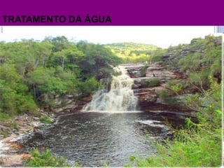 O documento discute a distribuição e qualidade da água no planeta, incluindo o ciclo da água, poluição por esgotos domésticos e industriais, bioconcentração de substâncias químicas, e o tratamento da água como forma de prevenir doenças.