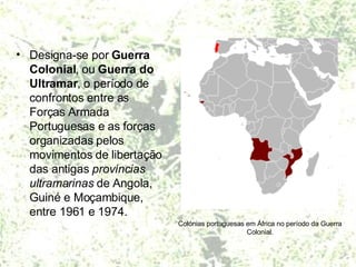 1) A guerra colonial em Portugal durou de 1961 a 1974 entre as forças portuguesas e movimentos de libertação em Angola, Guiné e Moçambique.