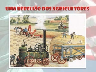 O documento apresenta uma divisão histórica dos Estados Unidos entre o Norte industrializado e o Sul agrícola e escravista. A tensão entre as regiões cresceu em torno de questões como tarifas alfandegárias e a expansão da escravidão para os novos estados, culminando na Guerra Civil Americana entre 1861-1865. Após a guerra, o Norte passou a dominar politicamente e economicamente o país.