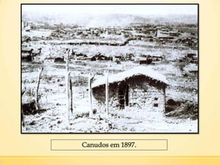 O documento descreve a Guerra de Canudos, um conflito entre 1896-1897 no interior da Bahia entre o exército brasileiro e os seguidores de Antônio Conselheiro. A região sofria com secas, fome e pobreza. Conselheiro liderou uma comunidade em Canudos que atraiu milhares, mas o governo a atacou por questões políticas e fiscais, massacrando homens, mulheres e crianças.