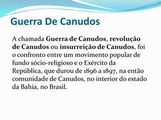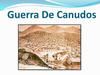 A Guerra de Canudos foi um conflito entre 1896-1897 na Bahia entre um movimento popular liderado por Antônio Conselheiro e o exército da República. A situação precária no Nordeste levou à revolta em Canudos, que resistiu por 10 meses até ser destruída pelas tropas federais após pedido de apoio do governo da Bahia. A violência oficial foi usada para calar aqueles que lutavam por direitos sociais.