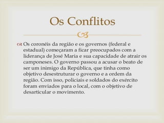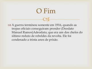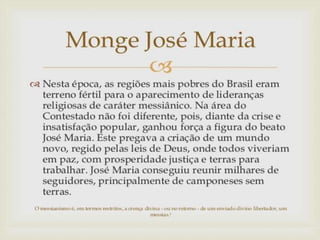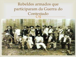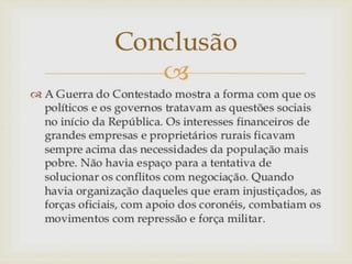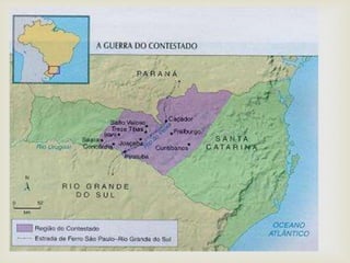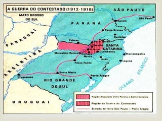 A guerra do Contestado (1912-1916) foi um conflito armado entre 20 mil camponeses e forças militares dos governos federal e estadual de Santa Catarina e Paraná sobre a disputa de terras na região do Contestado, onde estava sendo construída uma estrada de ferro que levou à perda de terras de camponeses.