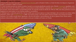 A Guerra Fria foi um conflito ideológico entre 1945-1989 entre Estados Unidos e União Soviética, que adotavam sistemas político-econômicos opostos. Os dois países disputavam influência global através da corrida armamentista, corrida espacial e envolvimento em conflitos em outros países. O fim da Guerra Fria ocorreu com a queda do Muro de Berlim em 1989 e o colapso da União Soviética nos anos 1990.