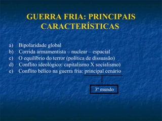 A Guerra Fria foi um período de tensão geopolítica entre 1945-1991 entre os Estados Unidos e a União Soviética, marcado pela corrida armamentista, conflito ideológico entre capitalismo e comunismo e disputa de influência no chamado Terceiro Mundo. A Organização das Nações Unidas foi criada nesse contexto para promover a cooperação internacional e a paz.