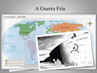 O documento discute a Guerra Fria, o período de tensão geopolítica entre 1945-1991 entre os Estados Unidos e a União Soviética. Apresenta os principais eventos da Guerra Fria como a corrida armamentista, conflitos como a Crise dos Mísseis de Cuba, e desdobramentos como a queda da União Soviética e fim da Guerra Fria.