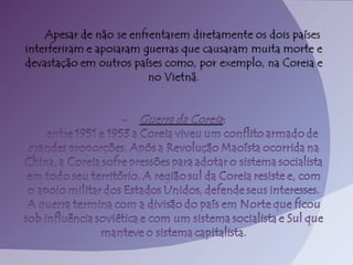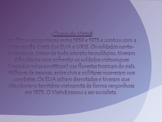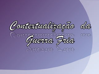 A Guerra Fria foi um conflito ideológico entre os Estados Unidos e a União Soviética, caracterizado pela corrida armamentista e pela divisão do mundo em blocos capitalista e socialista, sem confrontos militares diretos. Marcado pela construção do Muro de Berlim, pela luta política e repressão, e pela corrida espacial, esse período resultou em significativas inovações tecnológicas. O fim da Guerra Fria, em 1989, ocorreu devido a crises internas na URSS e à busca por maior liberdade econômica e democrática.