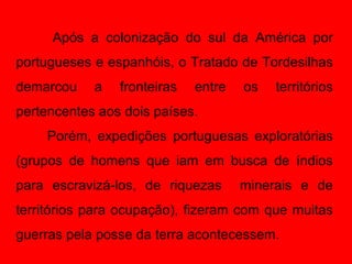 O documento descreve a colonização do sul do Brasil por portugueses e espanhóis e as guerras pela posse da terra após o Tratado de Tordesilhas. Em 1750, Portugal e Espanha assinaram um novo tratado que definiu as fronteiras entre suas colônias na América do Sul, aumentando significativamente o território brasileiro.