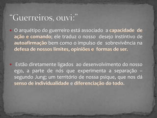 O documento discute o arquétipo do guerreiro de acordo com a psicologia analítica de Jung. Apresenta o guerreiro como ligado ao desenvolvimento do ego e impulsionado pela necessidade de afirmação e conquista, embora um guerreiro evoluído saiba confiar em suas próprias verdades e lidar com derrotas sem agressividade. Também defende que a sociedade ocidental valoriza as qualidades do guerreiro como representantes do progresso e da capacidade de ação.