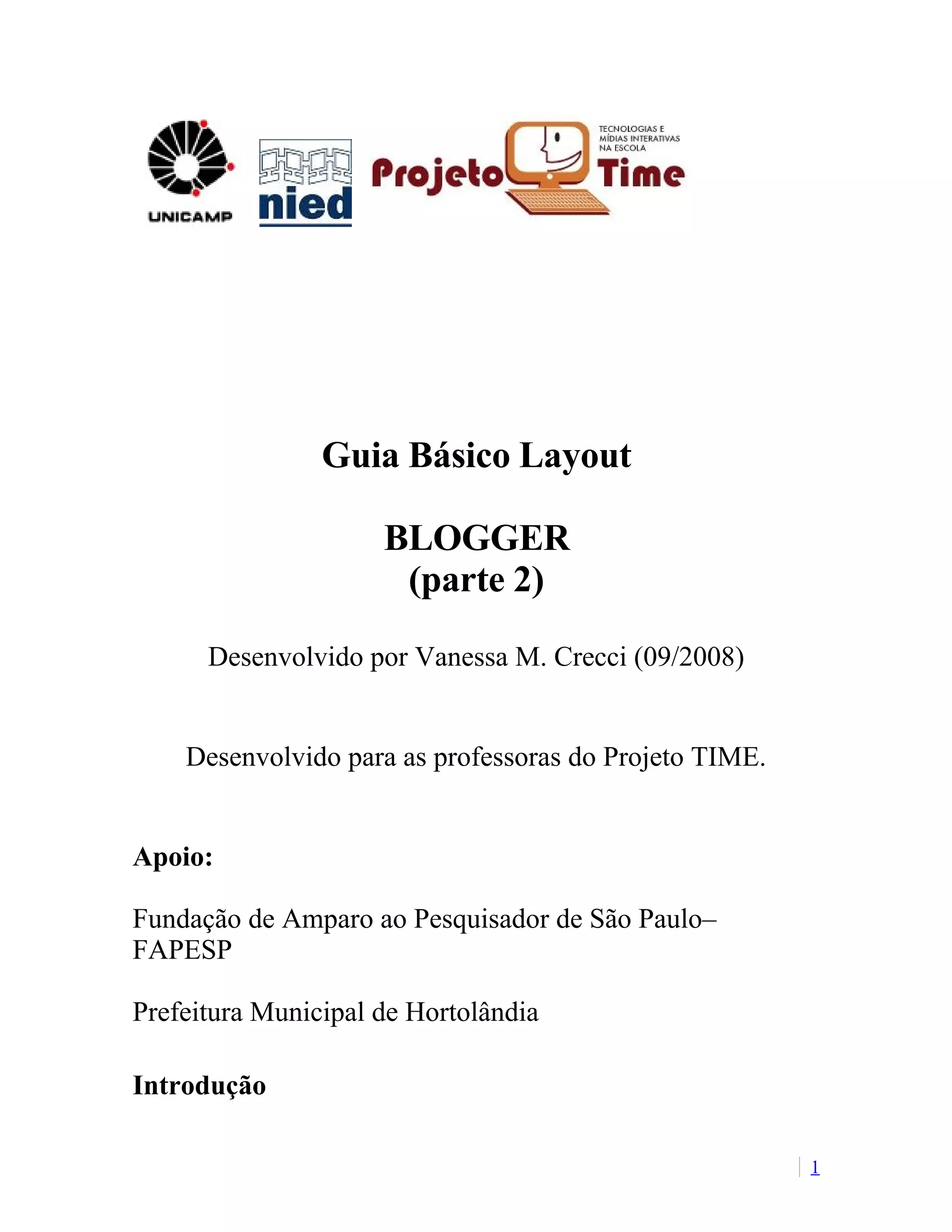 O documento fornece instruções sobre como personalizar o layout de um blog no Blogger, explicando: 1) Como acessar as opções de layout e editar elementos como título, descrição e gadgets; 2) Como alterar fontes e cores do blog; 3) Como editar o código HTML do layout.