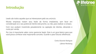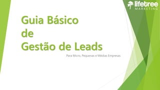 Este documento fornece um guia básico sobre gestão de leads para pequenas e médias empresas, explicando que leads são potenciais clientes interessados e como o processo de gestão de leads envolve geração, validação, distribuição e nutrição de leads para conversão em vendas.