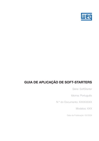 Este documento fornece um guia sobre soft-starters, discutindo métodos tradicionais de partida de motores, o funcionamento de motores de indução, métodos de comando, soft-starters, parâmetros, dimensionamento e instalação. Inclui anexos sobre cálculo de momento de inércia e um software de dimensionamento.