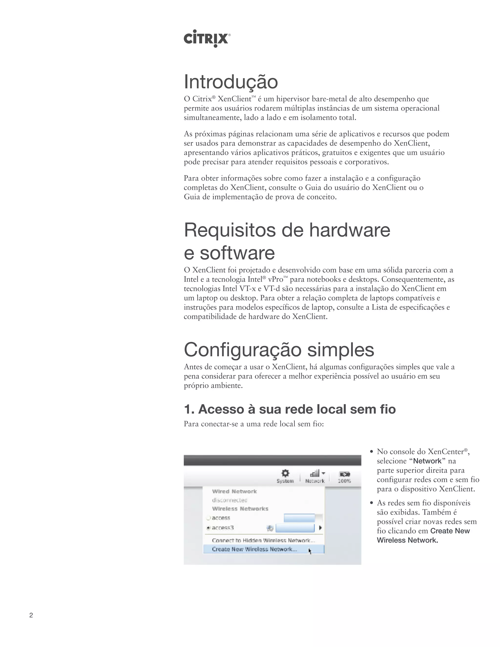O Citrix XenClient é um hipervisor bare-metal que permite executar múltiplas instâncias de sistemas operacionais em isolamento total. O documento detalha suas capacidades, requisitos de hardware, e fornece orientações sobre instalação, configuração e uso, além de sugerir aplicativos para demonstrar seu desempenho. Para mais informações, os guias de instalação e configuração do XenClient estão disponíveis no site da Citrix.