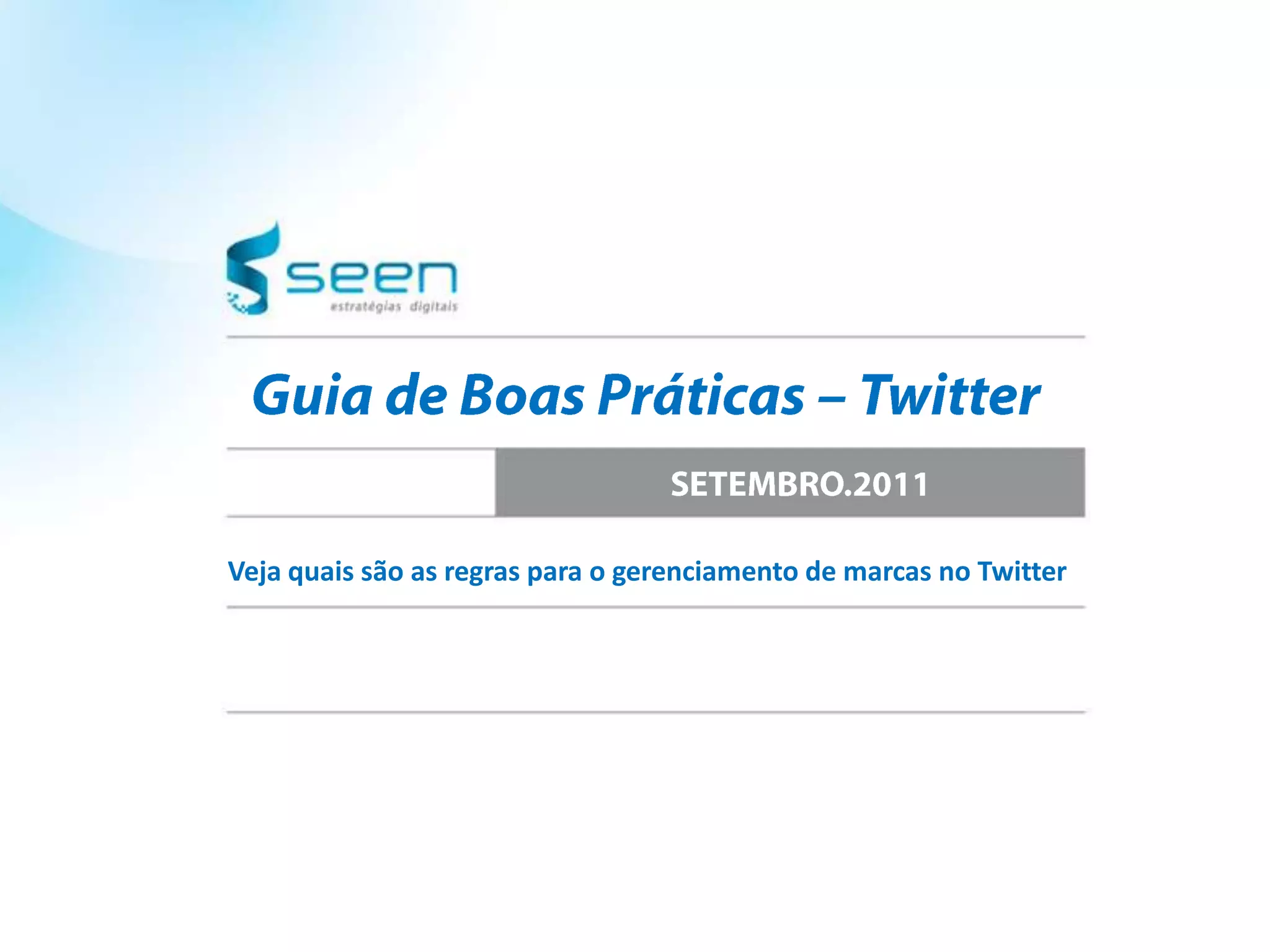 O documento fornece diretrizes para marcas usarem o Twitter como ferramenta de marketing, incluindo estratégias como branded content, SAC, perfis patrocinados e promoções. Recomenda comunicação ativa e frequente com os seguidores, identificando líderes de opinião e evitando mensagens automáticas ou agressivas.