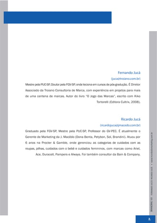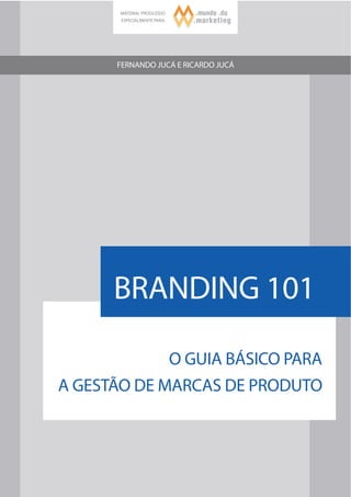Este documento fornece um guia básico sobre branding e gestão de marcas de produto em 4 etapas: 1) Definir o público-alvo; 2) Definir a promessa e personalidade da marca; 3) Construir preferência e reconhecimento da marca; 4) Garantir que o público encontre a marca. O guia destaca a importância de segmentar corretamente o mercado, definir benefícios claros para o consumidor, usar elementos consistentes de marca e ações de comunicação direcionadas.
