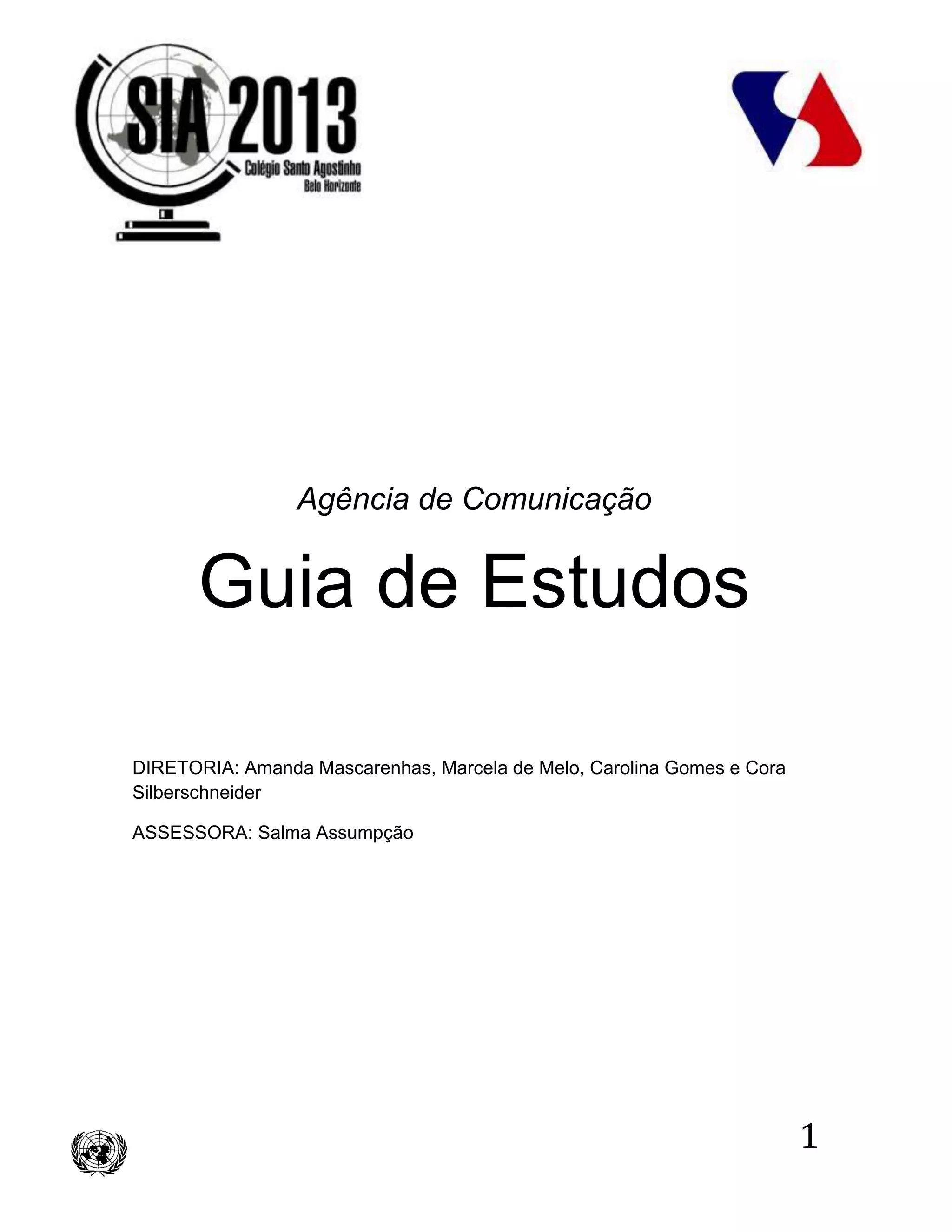 Este documento apresenta a equipe e as regras da Agência de Comunicação para a cobertura da Simulação Internacional de Assuntos (SIA). A diretora Amanda Mascarenhas e as vice-diretoras Marcela de Melo, Carolina Gomes e Cora Silberschneider liderarão a cobertura jornalística do evento. Os repórteres irão cobrir cada comitê e eventos gerais, enquanto fotógrafos e cinegrafistas registrarão momentos importantes. Todos devem seguir as regras de conduta para