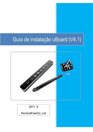Este documento fornece instruções para instalação do sistema uBoard, incluindo preparação do hardware e software, conexão do dispositivo, instalação de drivers e aplicativos, e configuração inicial. Detalha os componentes do sistema, funcionamento do quadro interativo e caneta digital, e passos para montagem física e configuração do dispositivo no computador.