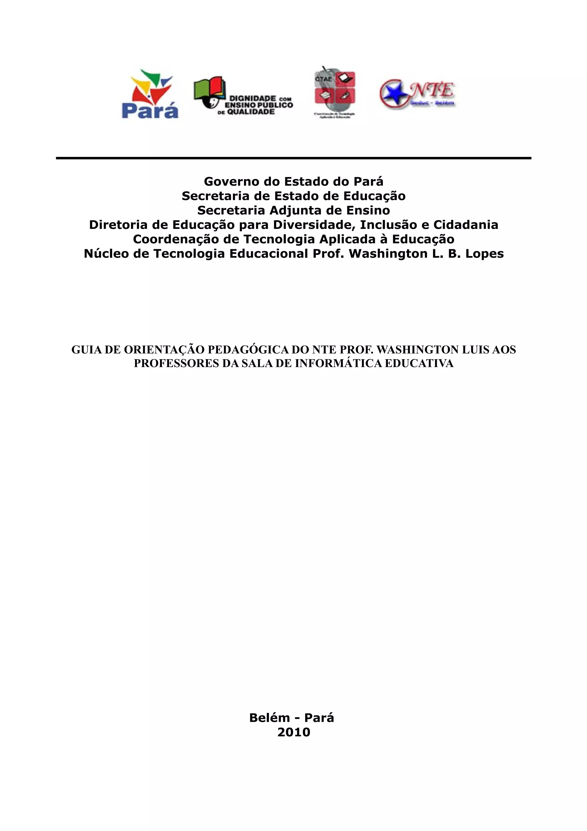 1) O documento fornece orientações pedagógicas para professores das salas de informática educativa do Núcleo de Tecnologia Educacional Prof. Washington L.B. Lopes em Belém-PA.
