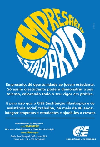 O documento é um guia para ajudar jovens estudantes na escolha da carreira, apresentando profissões em alta e áreas promissoras. Ele fornece informações sobre diversas profissões, incluindo requisitos, perspectivas e depoimentos de especialistas, para auxiliar os estudantes nessa importante decisão. O guia também traz orientações sobre estágio e ingresso no mercado de trabalho.