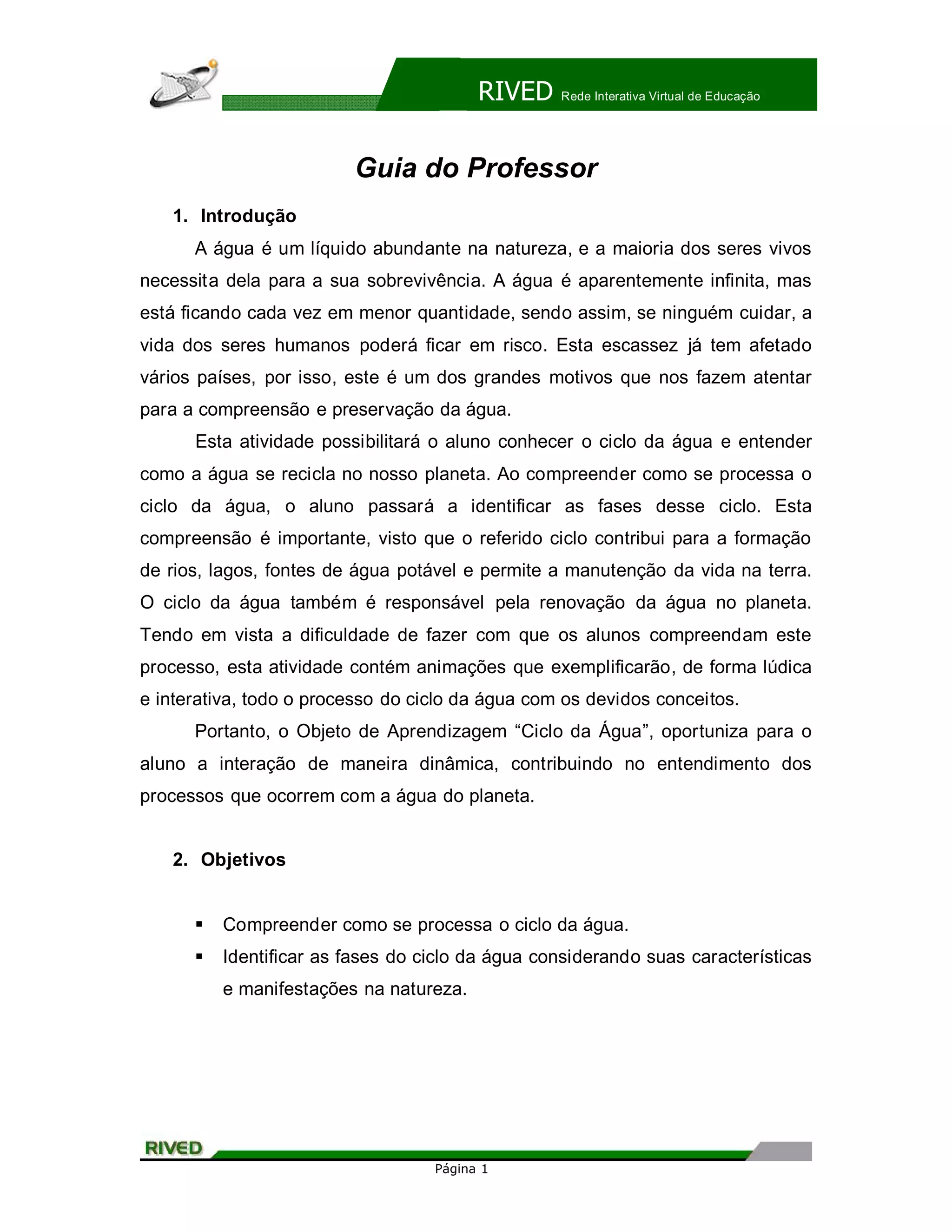 Este documento descreve uma atividade sobre o ciclo da água para alunos. A atividade usa uma simulação interativa para ensinar sobre as etapas do ciclo da água, incluindo evaporação, condensação e precipitação. O objetivo é ajudar os alunos a compreender este processo essencial e como a água é renovada no planeta.