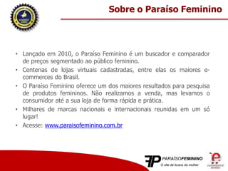 O documento apresenta os resultados de um estudo realizado pelo Paraíso Feminino sobre melhores práticas para aumentar a conversão no e-commerce de moda. Os principais fatores identificados foram: 1) ter um layout limpo e organizado; 2) usar fotos de alta qualidade e tamanho que destaquem os detalhes dos produtos; e 3) fornecer descrições detalhadas dos produtos com palavras-chave.