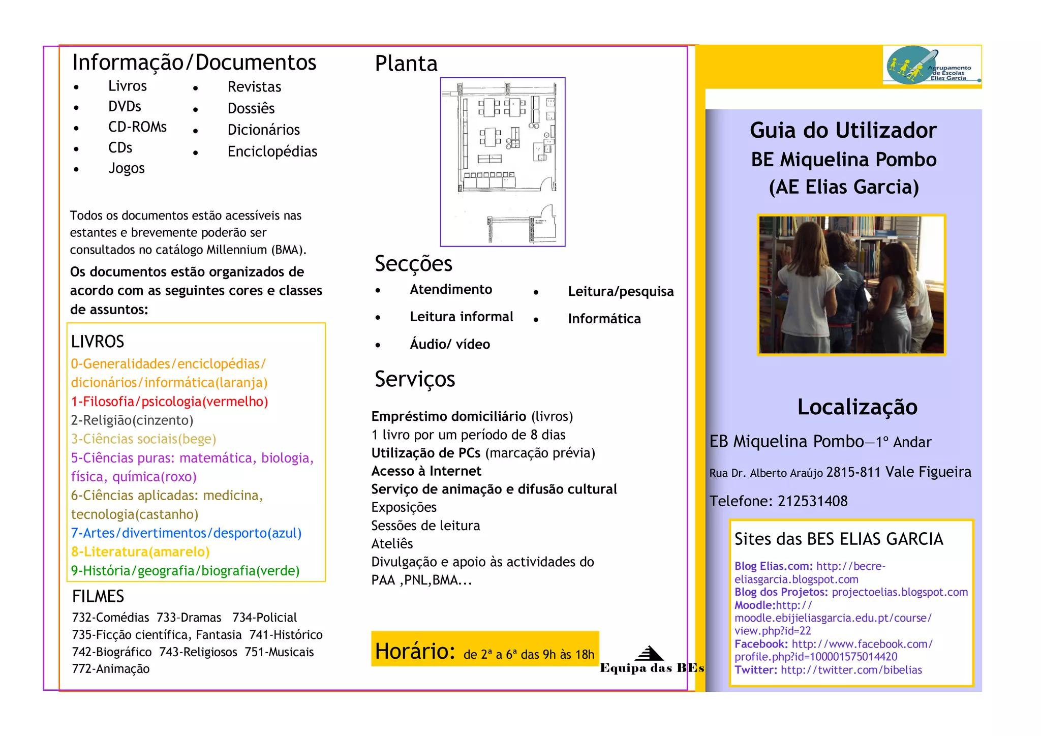 O documento fornece informações sobre os serviços e recursos disponíveis na Biblioteca Miquelina Pombo, incluindo a localização de livros, revistas, DVDs e outros materiais organizados por assunto; serviços como empréstimo domiciliar e uso de computadores; e regras para utilização da biblioteca.