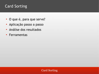 O documento explica a técnica de card sorting, que serve para categorizar informações com base na percepção dos usuários, visando criar um sistema de organização intuitivo. Ele detalha a aplicação, preparação e análise dos resultados, enfatizando a importância de entender a maneira como os usuários agrupam e nomeiam as informações. Além disso, apresenta sugestões de ferramentas e referências para facilitar a prática do card sorting.