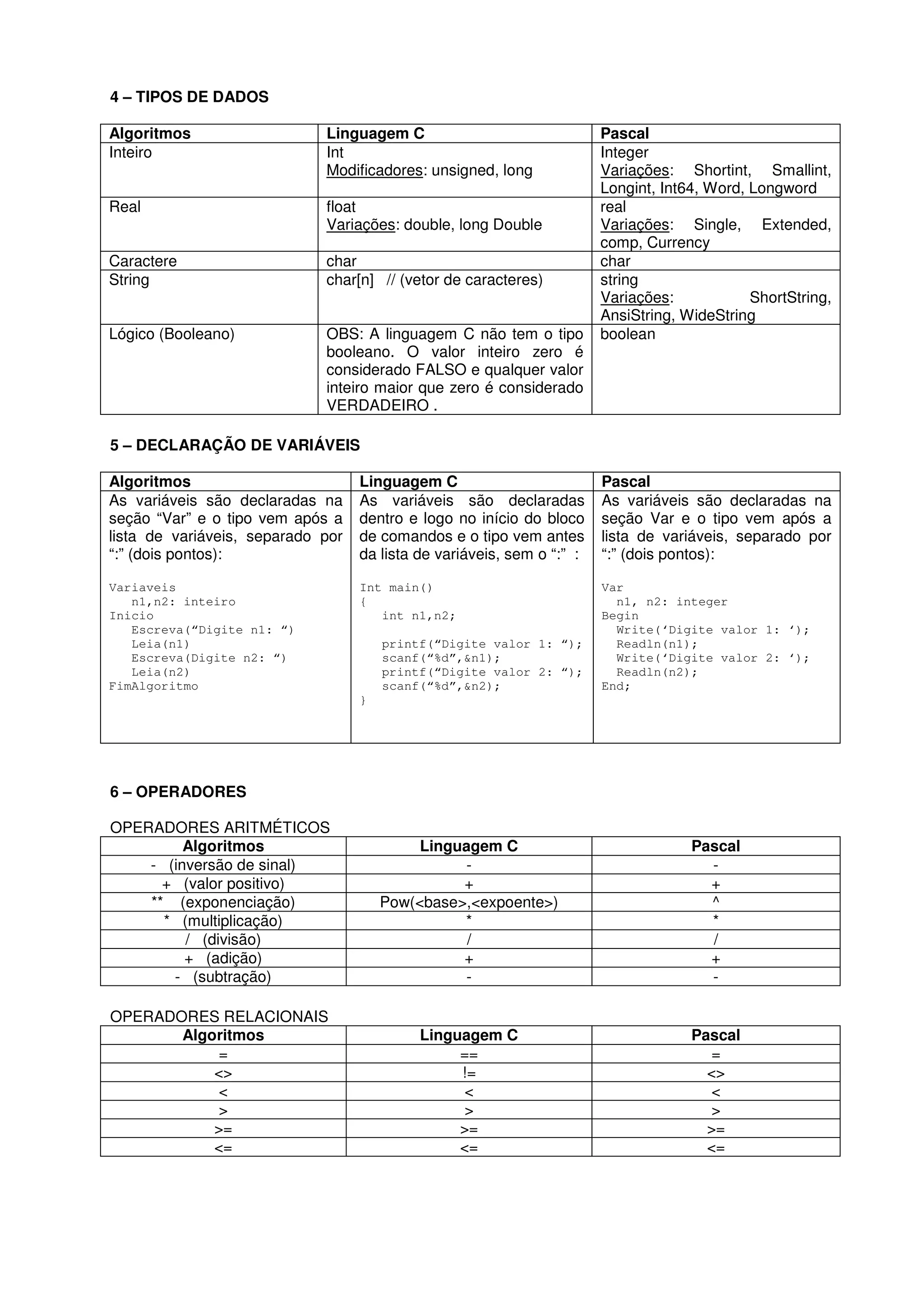 O documento fornece instruções sobre como traduzir algoritmos escritos em pseudocódigo para programas nas linguagens C e Pascal. Ele explica a sintaxe básica e as estruturas de cada linguagem, incluindo declaração de variáveis, tipos de dados, operadores, vetores, matrizes, registros e comandos de controle de fluxo.
